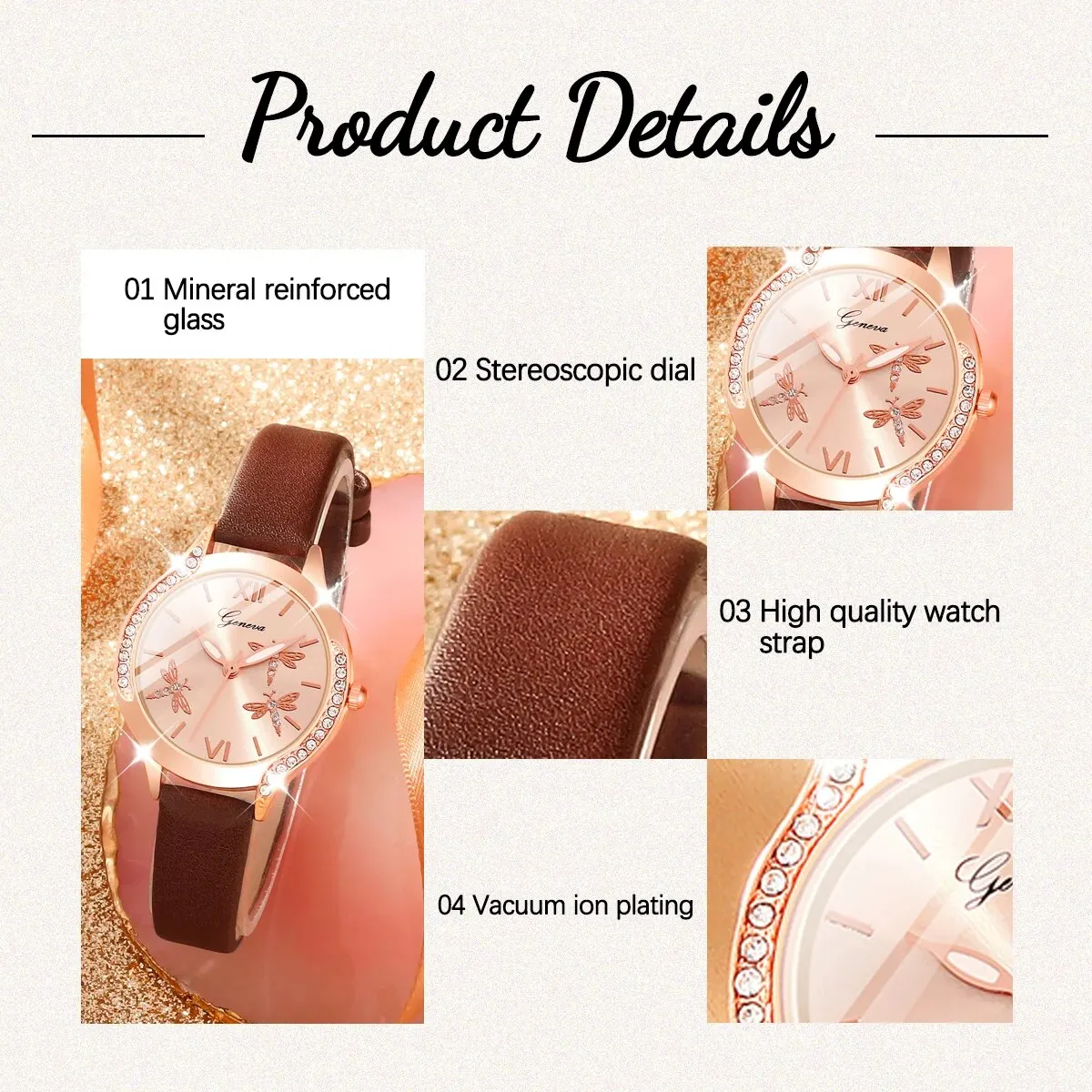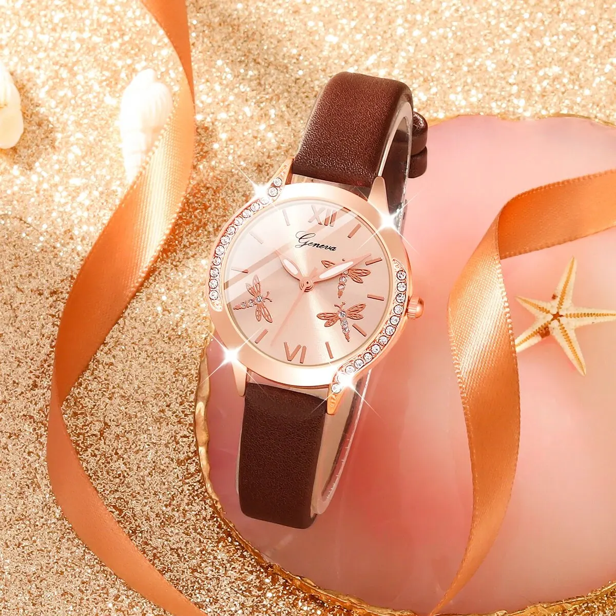 - Combine o relógio dourado de couro marrom com as pulseiras douradas de bolinhas e pingentes de borboleta com um vestido floral fluido e sandálias de couro. Adicione alguns anéis delicados para completar o look.