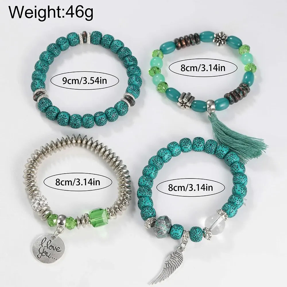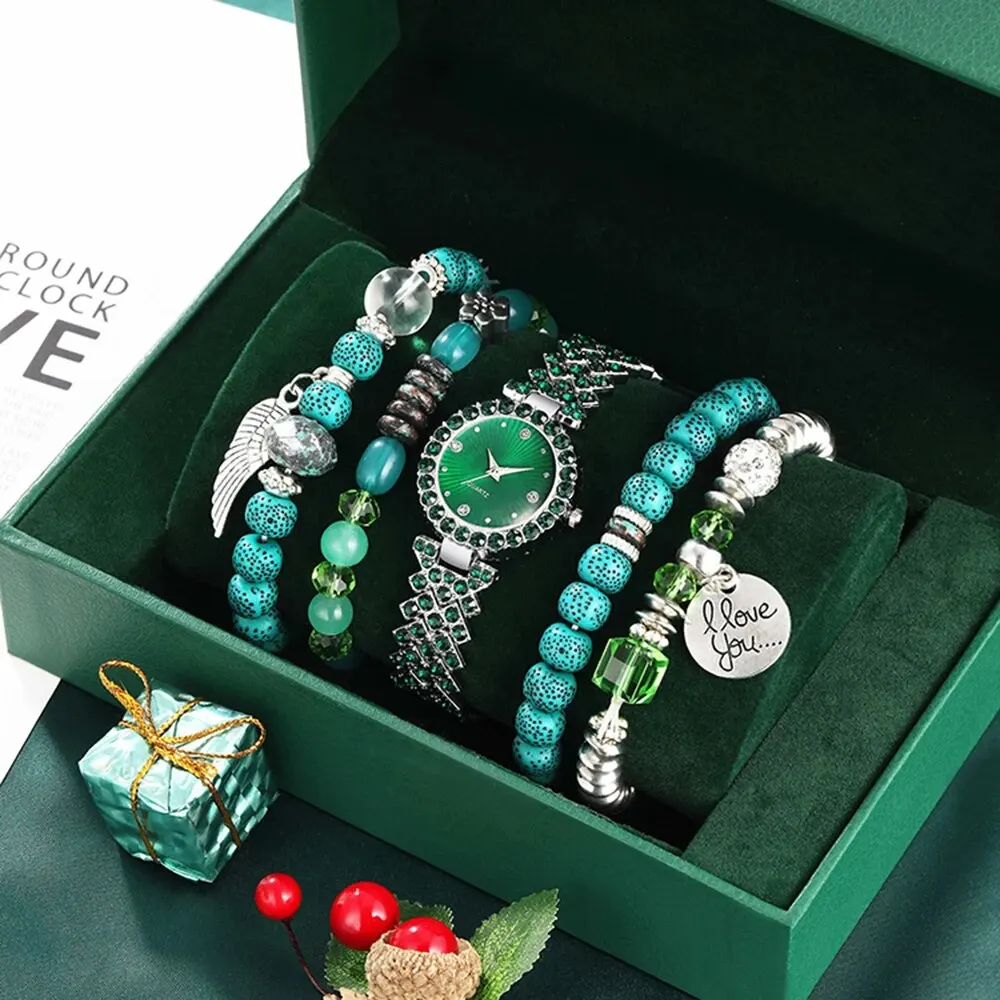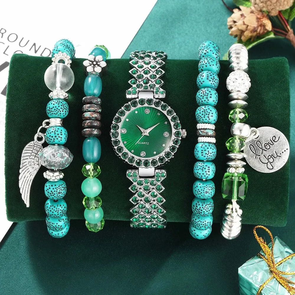 Dê um toque de frescor e elegância ao seu visual com estas combinações de pulseiras prata com bolinhas de azul turquesa e um relógio prata com fundo verde: